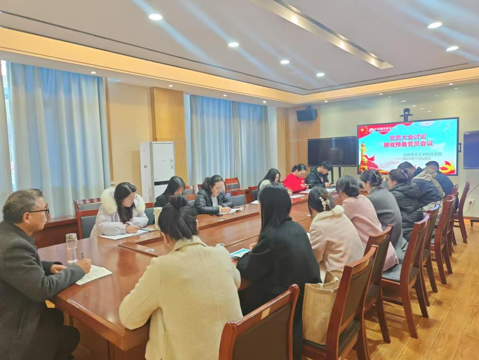 11月28日下午,马克思主义学院党支部在111会议室召开接收预备党员大会,对张乐等4名同志能否接收为预备党员事宜进行讨论和表决。全体党员出席了会议。会议由党支部书记王中立主持。