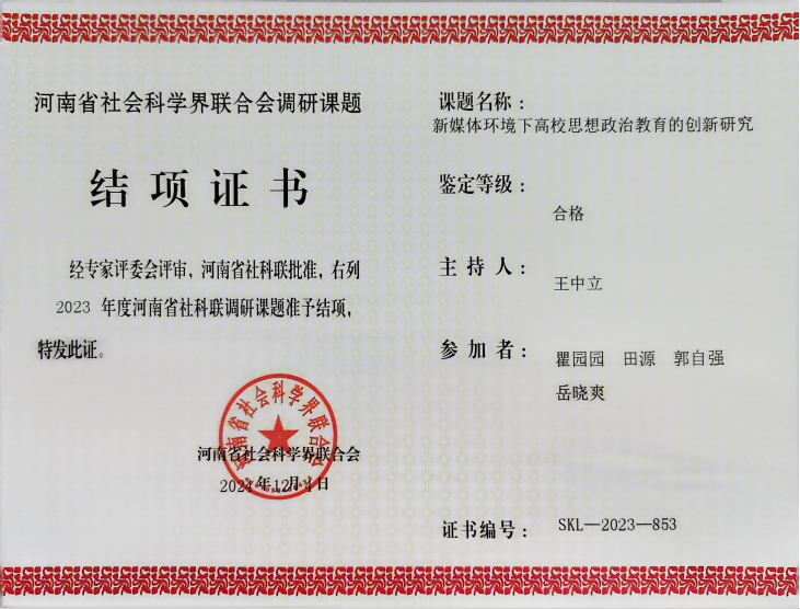 近日,Beat365中文官方网站马克思主义学院传来喜讯,由该院党支部书记王中立主持的调研课题《新媒体环境下高校思想政治教育的创新研究》顺利通过了河南省社会科学界联合会的评审,成功结项。