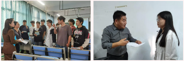 反馈环节,丁院长、江教授对两位授课老师的授课给予了高度赞许,认为两位教师能够按照教育部及河南省教育厅的要求开展教学,教学目标明确、教学内容丰富、教学重点突出、教学方法多样,教师亲和力和感染力较强,学生抬头率、点头率较高。随后,专家与两位思政课教师就授课过程中对教育部统编课件和《教学要点和参考资料》的使用情况、教材内容与教育部统编课件的补充情况进行了交流,详细询问了教学过程中碰到的重点难点问题,并结合两位思政课教师教学过程中知识点的讲授,给出了专业性的指导。