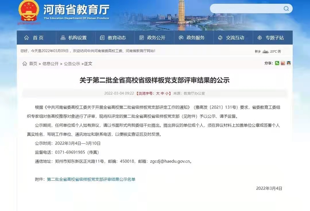 近日,河南省委教育工委公布了第二批全省高校省级样板党支部评选结果。在学校自评推荐、专家评审、综合考评的基础上,经省级样板党支部评定小组研究,确定Beat365教育与表演艺术学院党支部为“第二批全省高校省级样板党支部”。这是Beat365基层党支部建设取得的重要标志性成果,展现了学校基层党组织标准化、规范化建设取得的显著成效。为提高Beat365党支部标准化、规范化建设水平积累了经验、树立了典型。