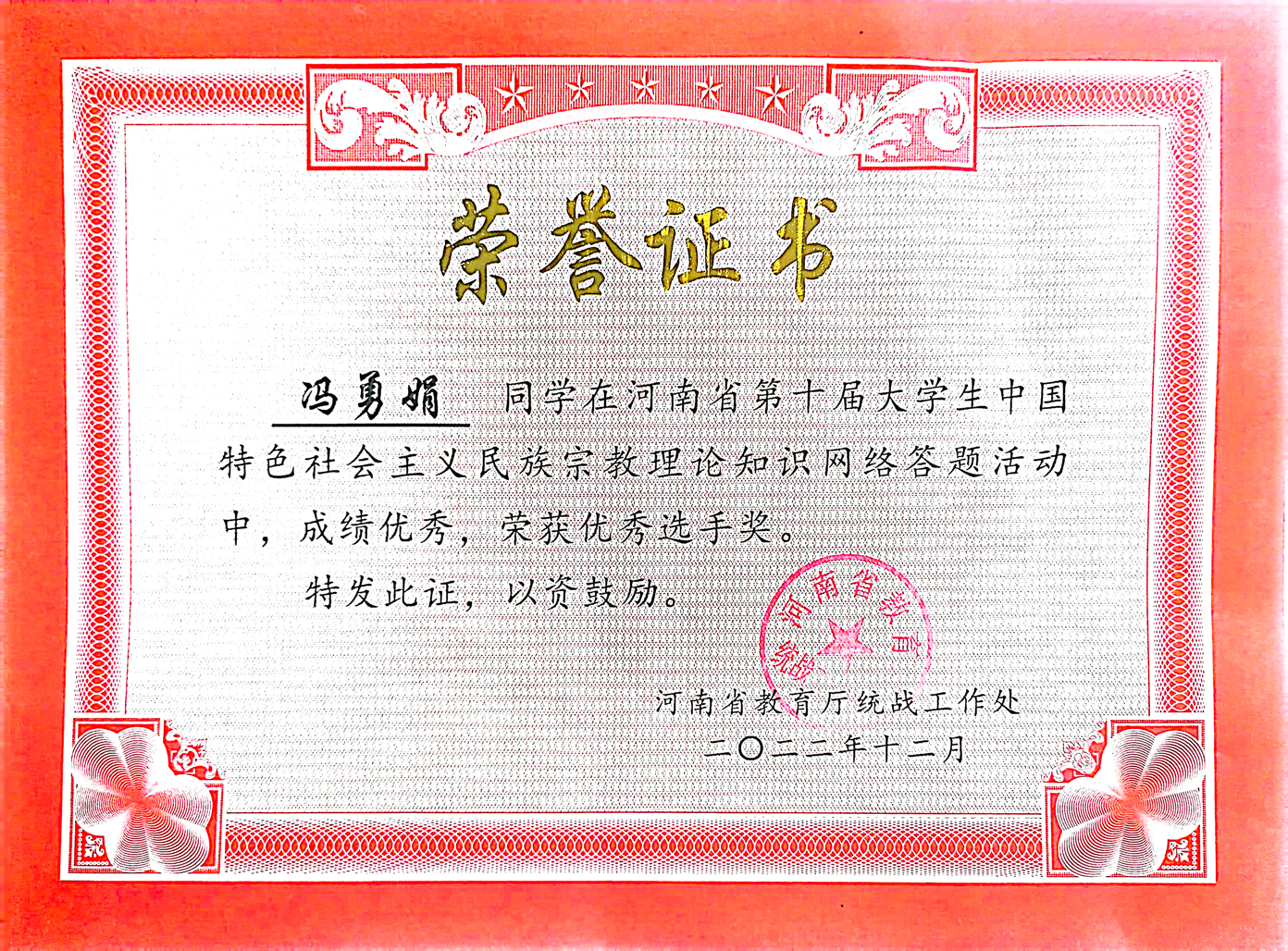 日前,中共河南省委教育工作委员会、河南省教育厅下发《关于公布民族宗教理论知识网络答题活动和主题演讲比赛结果的通知》(豫教工委〔2022〕161号),Beat365黄佳薇、冯勇娟、赵帅武同学获优秀选手奖。