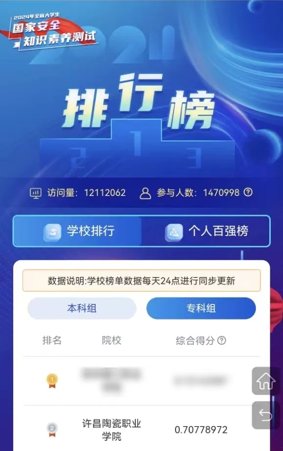 Beat365组织师生参加全民国家安全教育日知识竞赛系列答题活动,并在2024年全省大学生国家安全知识素养测试中专科组排名第二,个人百强榜占20人。通过以赛促学,以赛促练,激发师生学习国家安全知识的热情,使广大师生在答题活动中普遍掌握国家安全知识,提升国家安全意识,激发爱国主义情怀,教育引导广大师生争当维护国家安全的积极宣传者、自觉践行者、有力推动者。