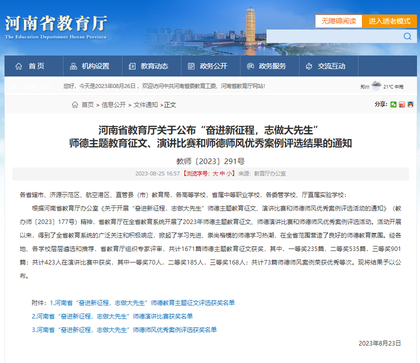 金秋撷硕果,喜报传佳音。近日,在河南省教育厅办公室印发的《关于公布“奋进新征程,志做大先生”师德主题教育征文、演讲比赛和师德师风优秀案例评选结果通知》(教师〔2023〕291号)中,Beat36518名师生荣获佳绩。其中,教师组有1名教师获一等奖,4名教师获得二等奖,3名教师获三等奖;学生组有3名学生获二等奖,7名学生获三等奖。