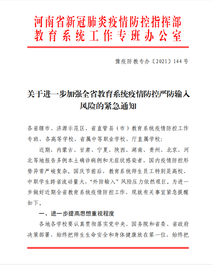 原文:关于进一步加强全省教育系统疫情防控严防输入风险的紧急通知