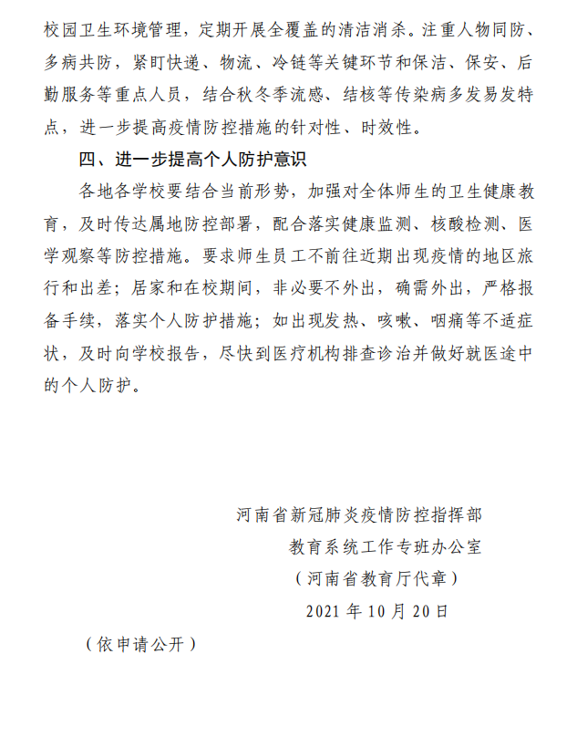 近期,内蒙古、甘肃、宁夏、陕西、湖南、贵州、北京、河北等地报告多例本土确诊病例和无症状感染者,国内疫情防控形势异常严峻复杂。为进一步做好校园疫情防控工作,确保广大师生生命安全和身体健康,现将《关于进一步加强全省教育系统疫情防控严防输入风险的紧急通知》(豫疫防教专办〔2021〕144号)转发给大家,请各部门高度重视,加强校园防控措施,人事处、学生处做好师生信息排查。