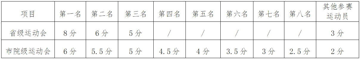 1.参加省级运动会的运动员,每次每项加3分,获前三名的运动员每次每项依次另加5、3、2分;参加校级运动会的运动员,每次每项加2分,获前八名的运动员每次每项依次另加4、3.5、3、2.5、2、1.5、1、0.5分。