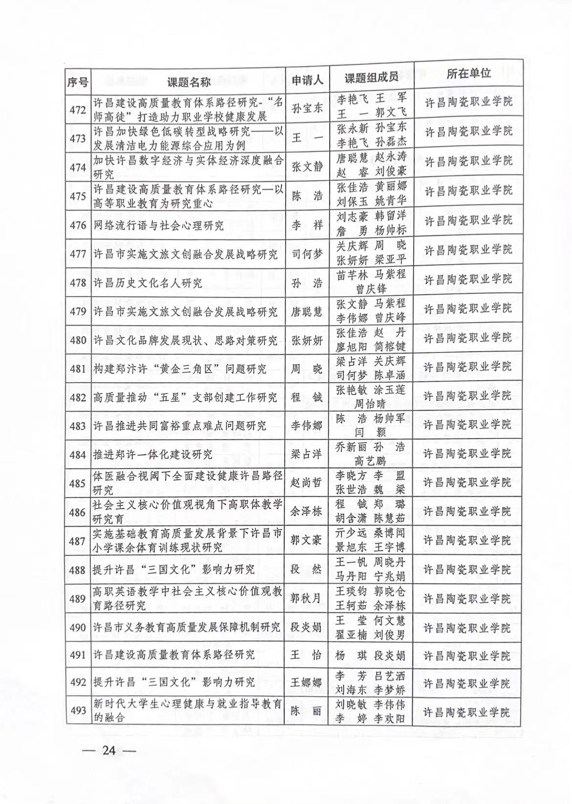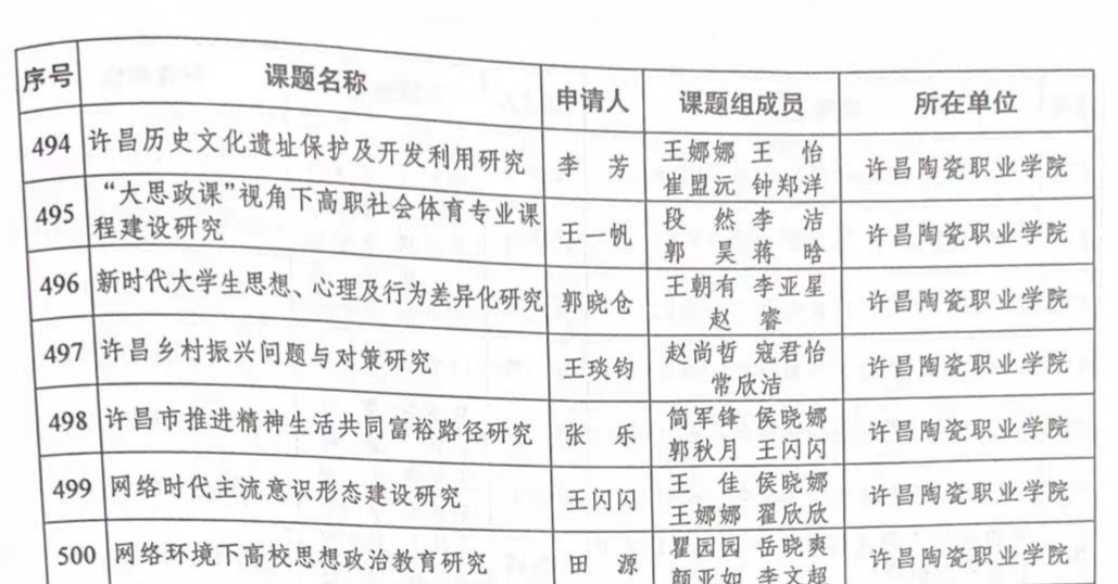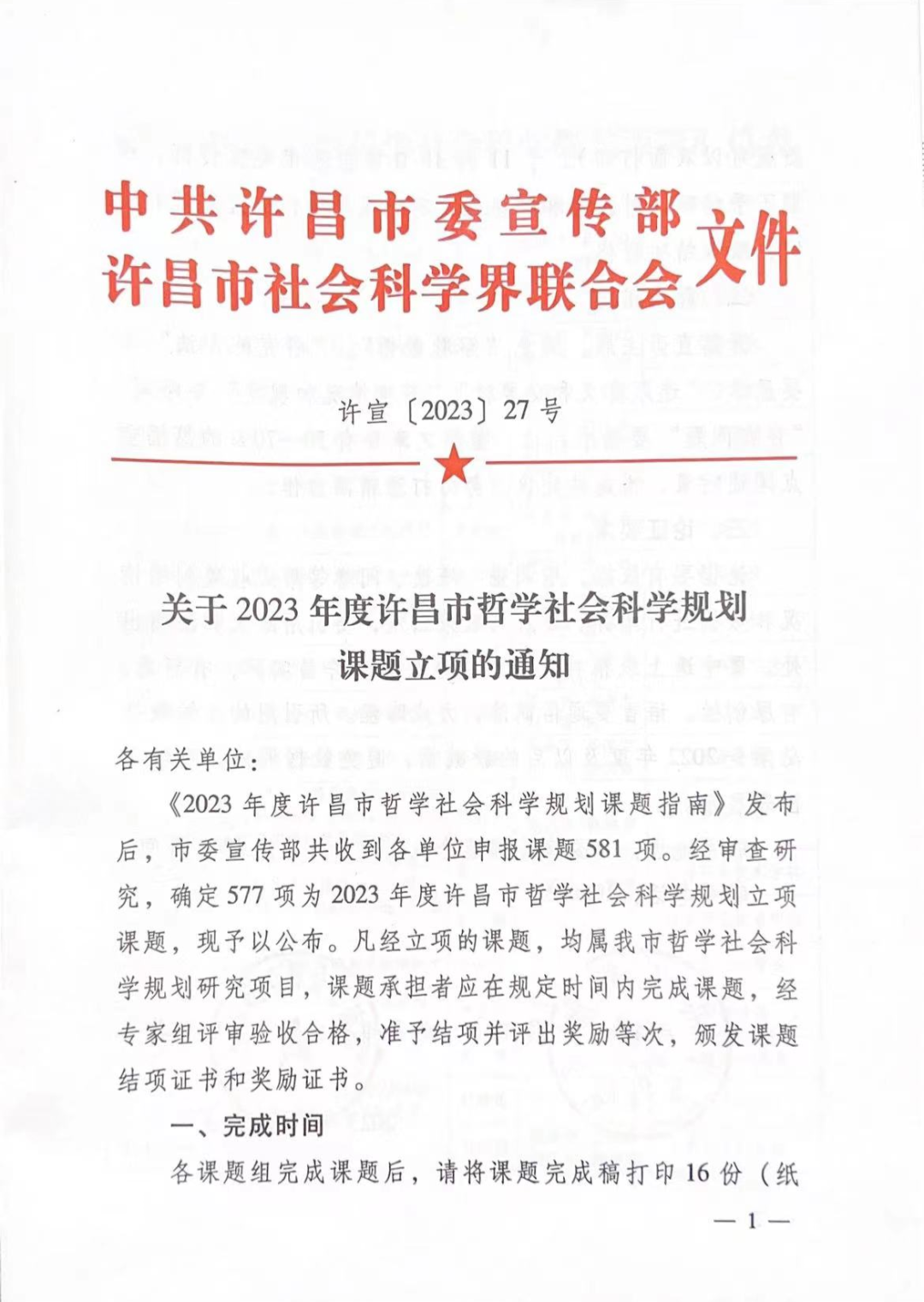 日前,许昌市委宣传部与市社会科学界联合会公布了2023年度许昌市哲学社会科学规划课题立项名单(许宣[2023]27号)。Beat365共计72个项目获批准,立项数量再创历史新高。本次项目立项情况展现了Beat365基础研究能力迈上新台阶,对争取更高级别科研项目、取得高层次科研成果具有促进作用。