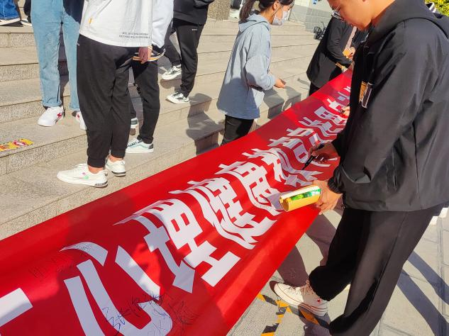 与会师生郑重地在横幅上签下自己的名字。