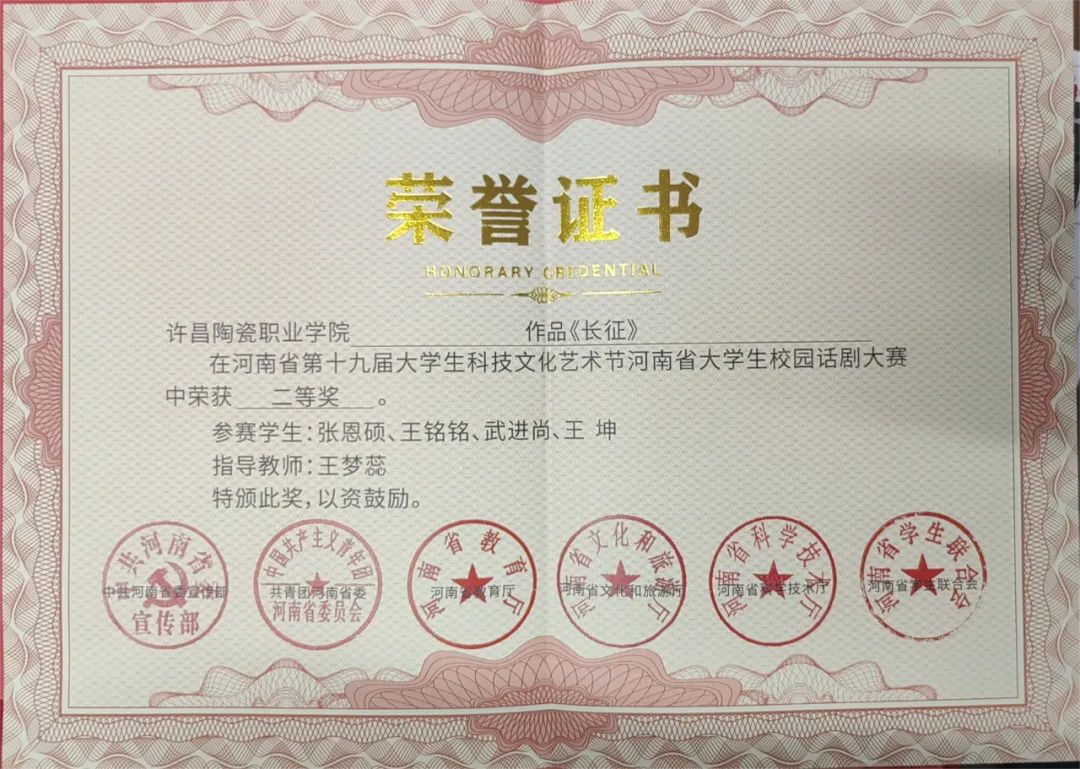 近期,由省委宣传部、团省委、省教育厅、省文化和旅游厅、省科技厅、省学联联合主办的第十九届大学生科技文化艺术节落下帷幕,Beat365选送的话剧、演讲、舞蹈等各类参赛作品,均表现优异、喜获佳绩。参赛作品《长征》《钧瓷》获得河南省大学生校园话剧大赛二等奖;由李杰同学演讲的《新时代新征程,坚持和发展新时代中国特色社会主义》获得河南省大学生校园演讲大赛二等奖;参赛作品《鼓乐行》获得河南省大学生校园舞蹈大赛业余组三等奖。