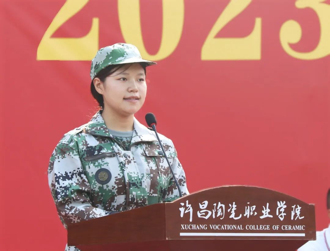 23级新生代表肖冉发言。她号召大家,珍惜军训时光,并把在此期间养成的良好品德和作风带到今后的学习中去,高标准、严要求的规范自己的言行,遵守学校的各项规章制度,踏踏实实地学会学习、学会做人,刻苦锻炼,遵纪守信,自强不息,自立有为,培养创造性学习能力,做一名优秀的大学生。