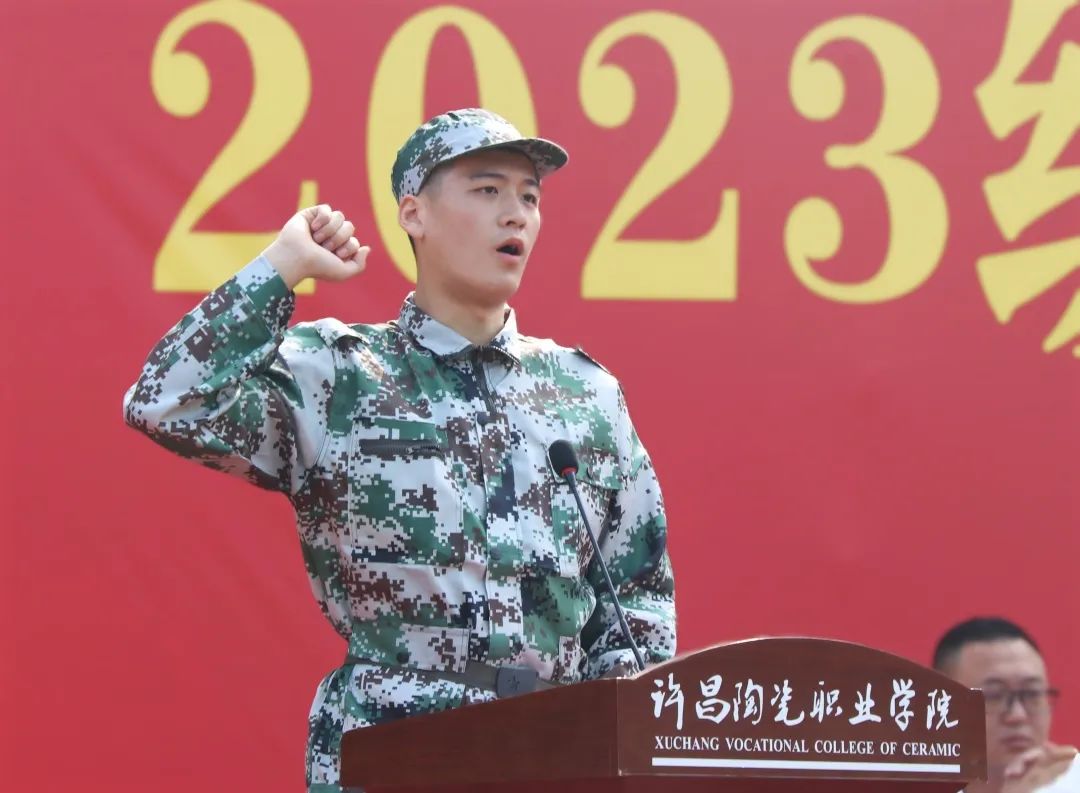 2023级学生孙瑜作为参训学员领誓:服从命令,听从指挥,尊重教官,刻苦训练,遵守纪律,磨炼意志,不怕困难,争当军训优秀学员,争创军训先进集体,用意志书写学校生活新篇章,用行动打开梦想之门!