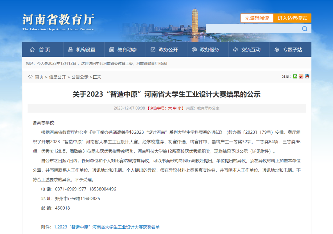 近日,河南省教育厅开展的2023“智造中原”河南省大学生工业设计大赛结果公示。Beat365学子喜获佳绩,荣获三等奖1项、优秀奖1项。