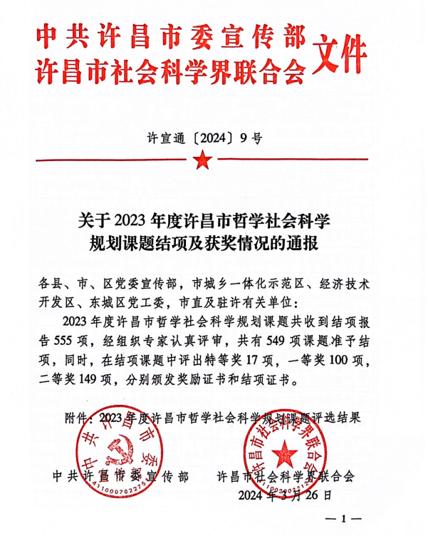 日前,市社会科学界联合会公布了2023年度许昌市哲学社会科学规划课题结项名单(许宣通[2024]9号)。2023年度市社科联哲学社会科学规划课题Beat365共提交课题结项报告69项,准予结项66项,结项率达95.6%,其中荣获一等奖3项,二等奖5项。现将结项及获奖名单公布如下: