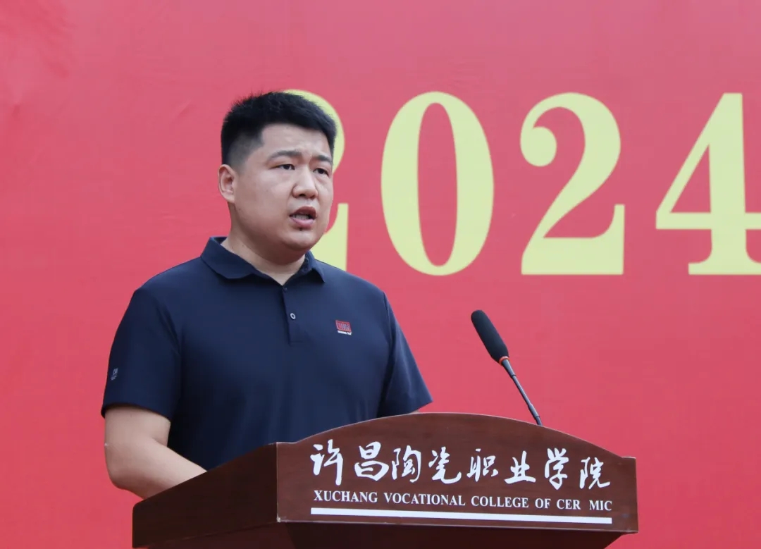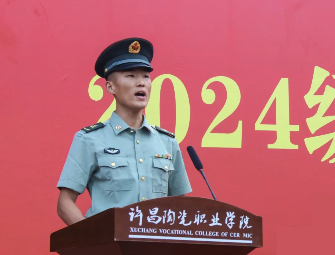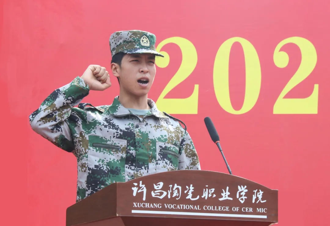 23级学生代表王永康发言。他通过讲述自己在许陶的军训经历、成长故事,鼓励学弟学妹们要以更加饱满的热情、更加顽强的毅力投入到军训以及今后的大学生活中去,用实际行动证明自己的成长与进步,用拼搏奋进书写少年壮志,奔赴无限广阔、无限美好的未来。