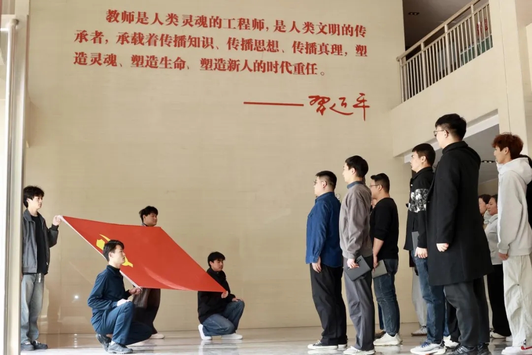 思政课结束后,陶瓷艺术与智能建造学院党支部组织师生党员代表重温入党誓词。党员们列队面向党旗举拳宣誓,每一个字都饱含着对党的忠诚,每一句誓言都坚定了为党的事业奋斗终身的决心。