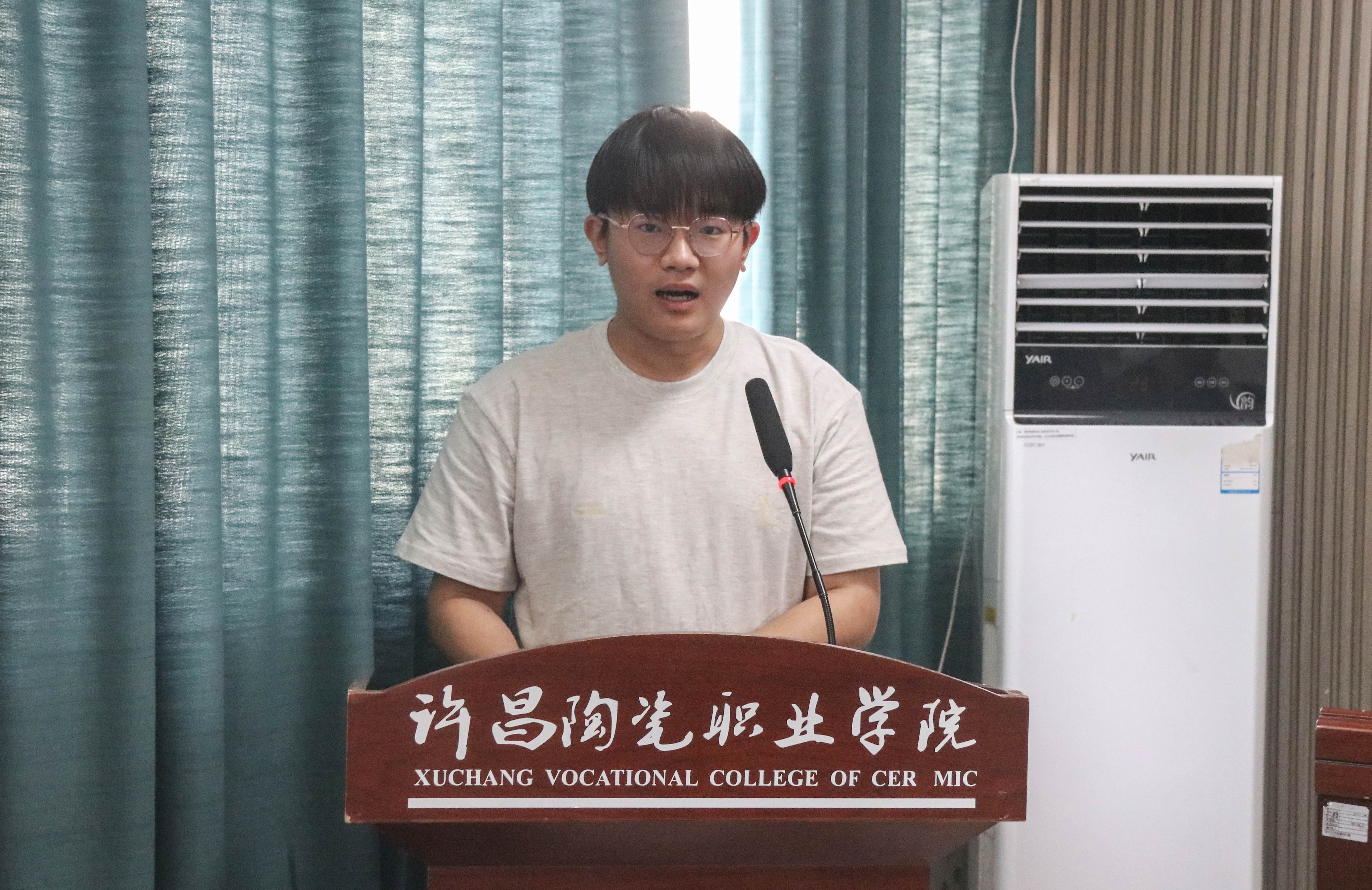 智慧康养与人文教育学院2024级播音与主持班心理委员李宗尚作为学生代表发言。他呼吁全体心理委员以身作则,关爱自己,倾听陪伴同学,积极参与活动,为同学们的心理健康保驾护航。发言最后,他号召全体同学加入活动中,学会自我关爱、分担压力,共同成长。