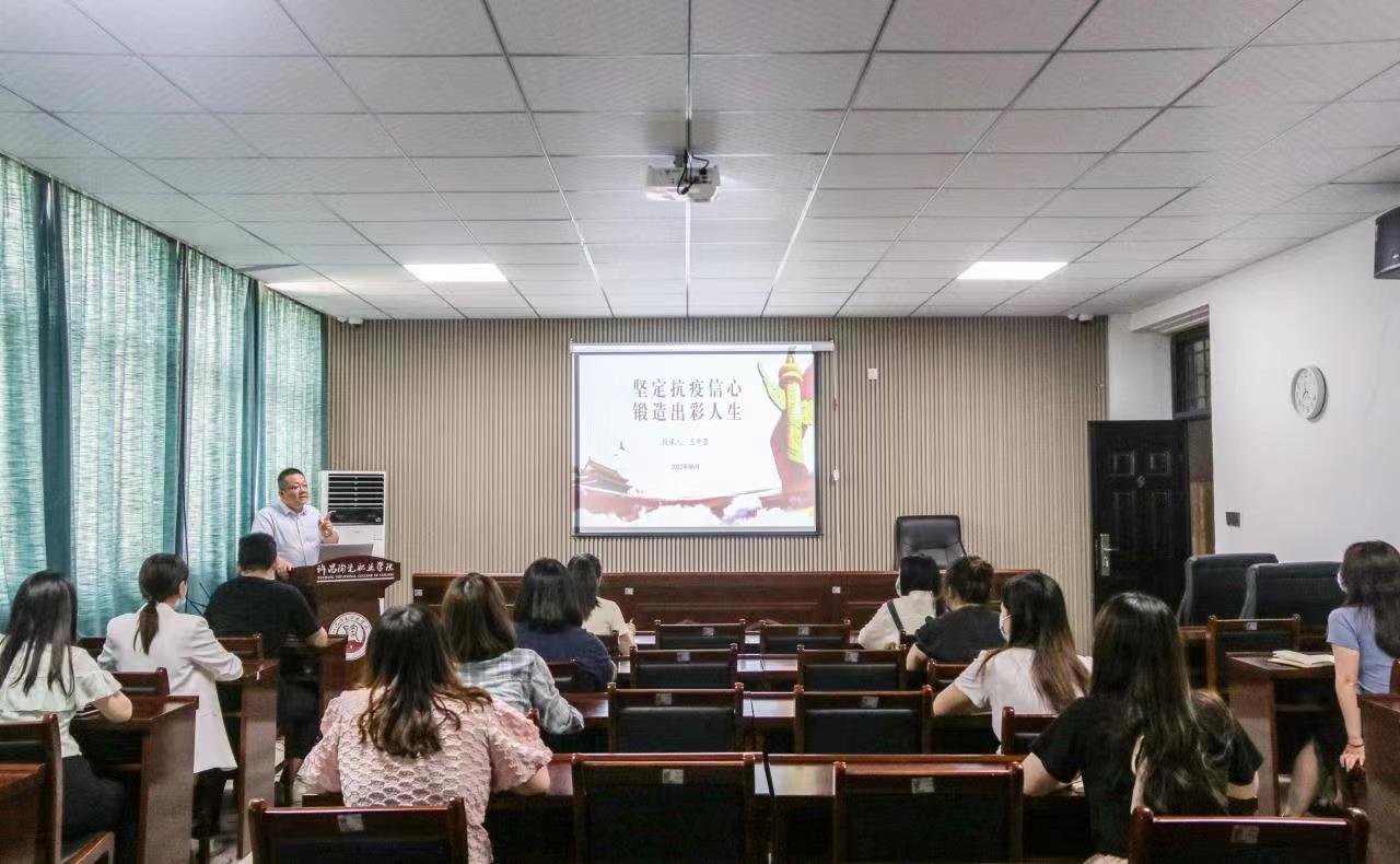 肖绍俊以“弘扬伟大抗疫精神,争做优秀新时代青年” 为题,从深刻理解伟大抗疫精神的时代内涵、深刻认识抗疫斗争中彰显的中国制度优势,深刻践行新时代青年的使命与担当三个方面,结合当前疫情形势和特点,运用详实的数字和生动的案例深入诠释了“生命至上、举国同心、舍生忘死、尊重科学、命运与共”的伟大抗疫精神,通过抗疫斗争取得重大战略成果,进一步分析了中国特色社会主义制度的显著优势,要求全校师生遵守防疫规定,坚定战胜疫情的信心,凝聚起共抗疫情的青春力量。