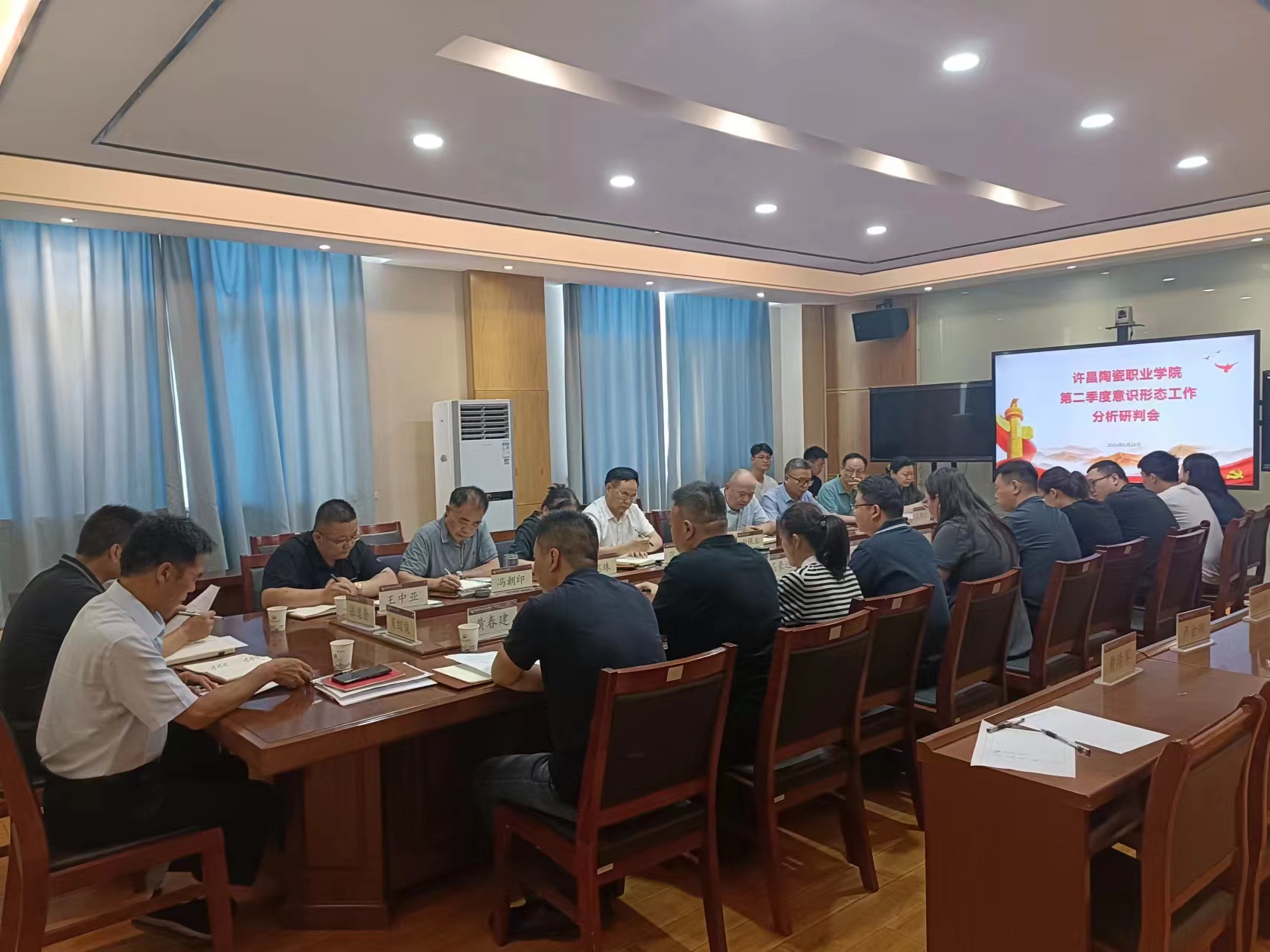 6月26日上午,学校在111会议室召开2024年第二季度意识形态工作分析研判会,校领导肖绍俊、张道金、黄春建、王中亚、冯朝印、郭磊出席会议。各单位负责人、各党支部书记参加会议。党委书记肖绍俊主持会议。