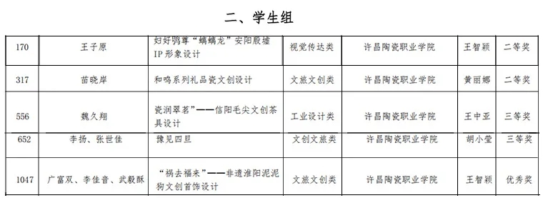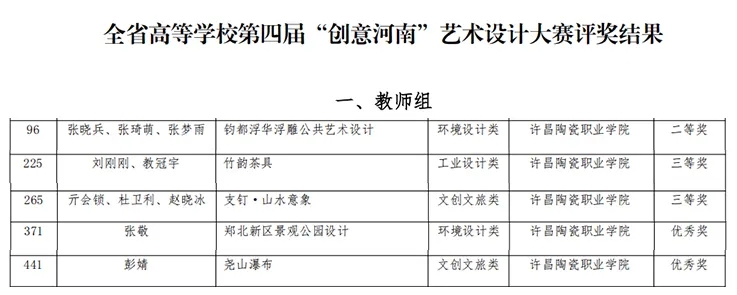 近日,河南省教育厅发布了全省高等学校第四届“创意河南”艺术设计大赛评奖结果,Beat365建筑与陶瓷设计学院师生在本次大赛中共获奖10项,其中荣获二等奖3项、三等奖4项、优秀奖3项,获奖作品涵盖了环境设计类、工业设计类、文创文旅等多个领域,充分展示了Beat365在艺术设计领域的多元发展和综合实力。