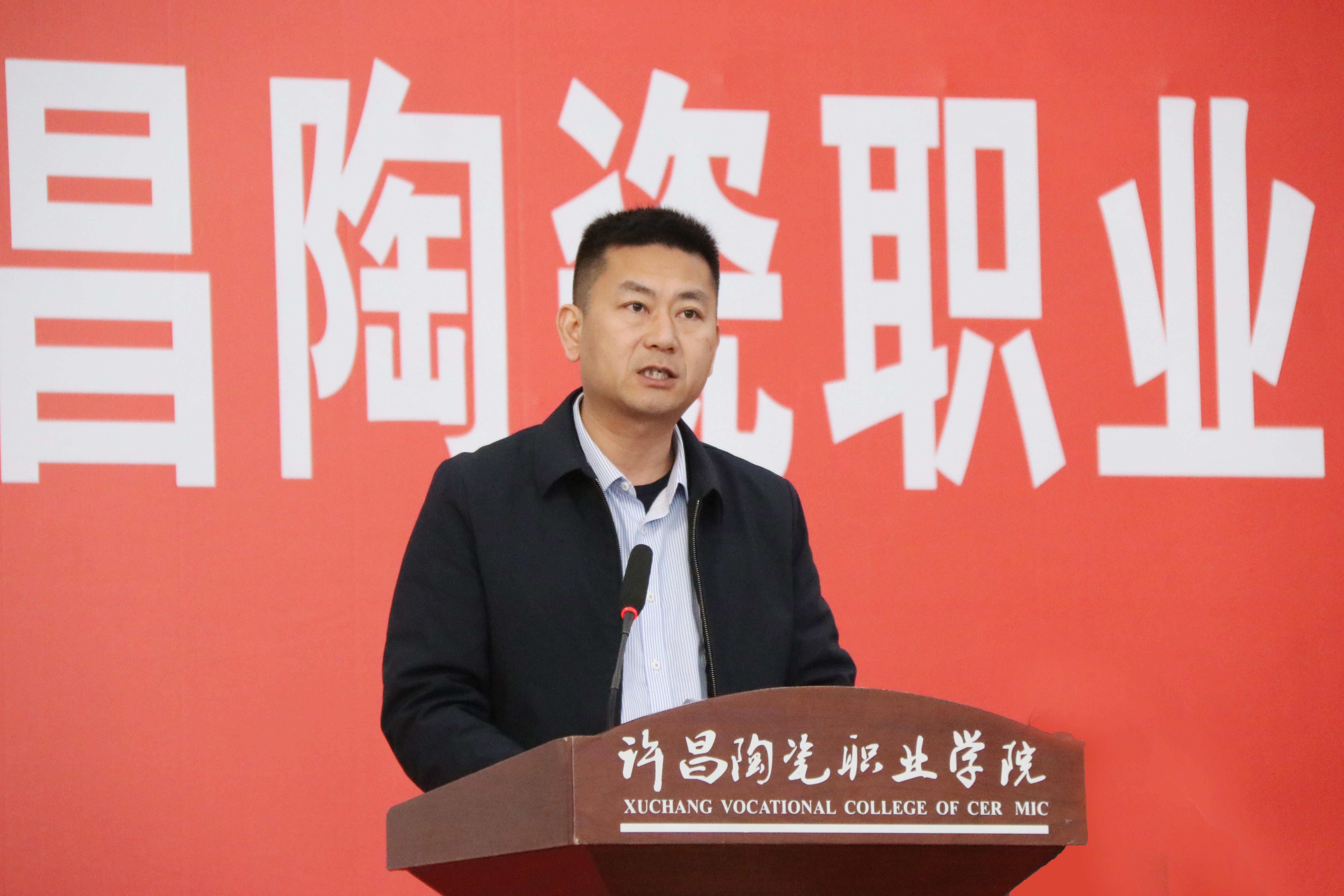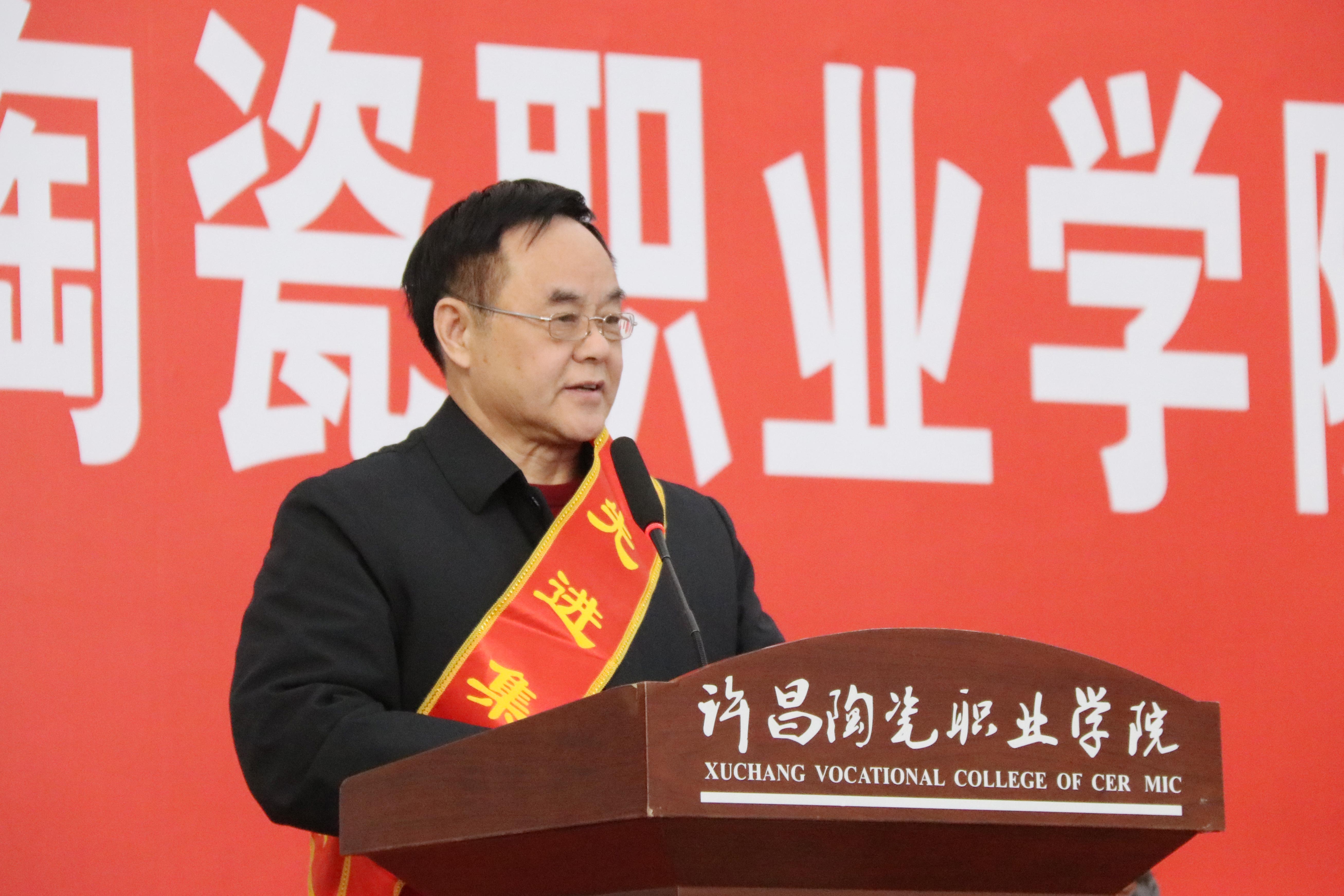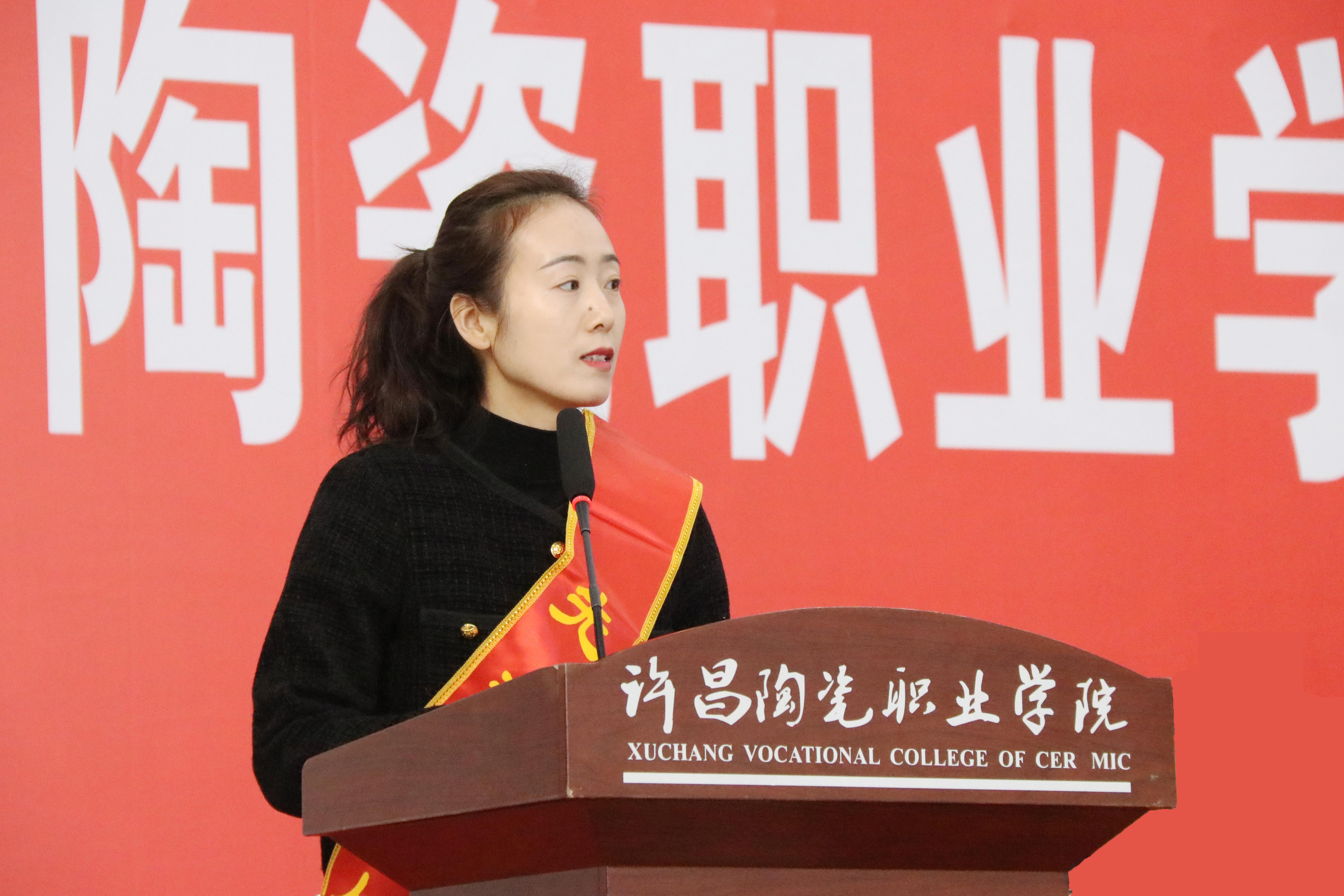 先进集体代表陶瓷艺术与智能建造学院院长张永祥、先进个人代表经贸与工商管理学院教师亓姗姗上台发言。