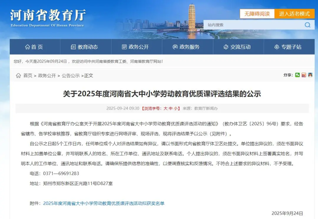 近日,河南省教育厅发布《关于2025年度河南省大中小学劳动教育优质课评选结果的公示》文件,Beat365选送的两位参赛教师凭借扎实的教学功底和创新的课程设计,双双荣获省级二等奖!此次获奖是本校在该项赛事中的重要突破,充分彰显了Beat365劳动教育改革的阶段成效。