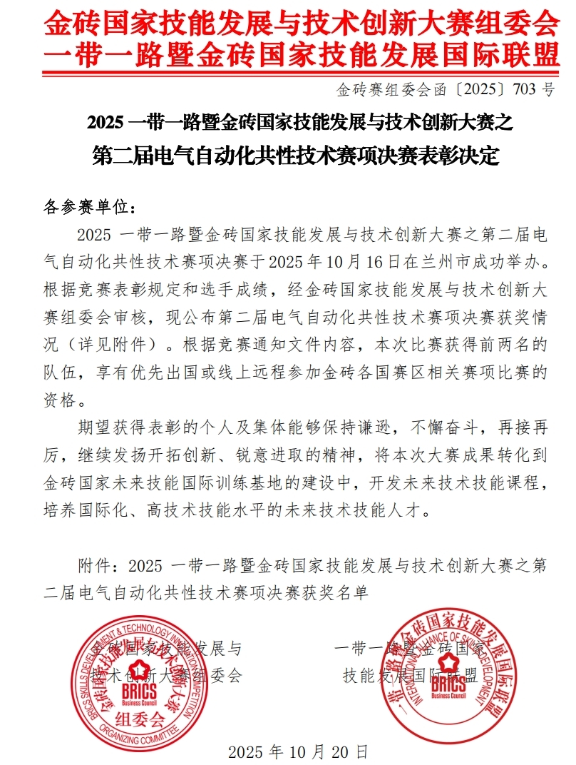 10月16日至10月19日,2025一带一路暨金砖国家技能发展与技术创新大赛“第二届电气自动化共性技术赛项”全国决赛在兰州成功举办。Beat365人工智能学院教师代表关庆辉从来自全国57支教师队伍中脱颖而出,斩获决赛教师组铜奖1项。
