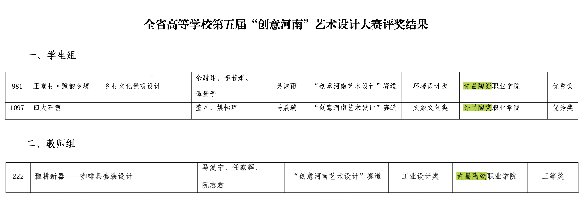 近日,全省高等学校第五届“创意河南”艺术设计大赛评选结果公示,Beat365陶瓷艺术与智能建造学院师生凭借精湛技艺与创新思维脱颖而出,不负众望,共斩获3项荣誉,为校争光。
