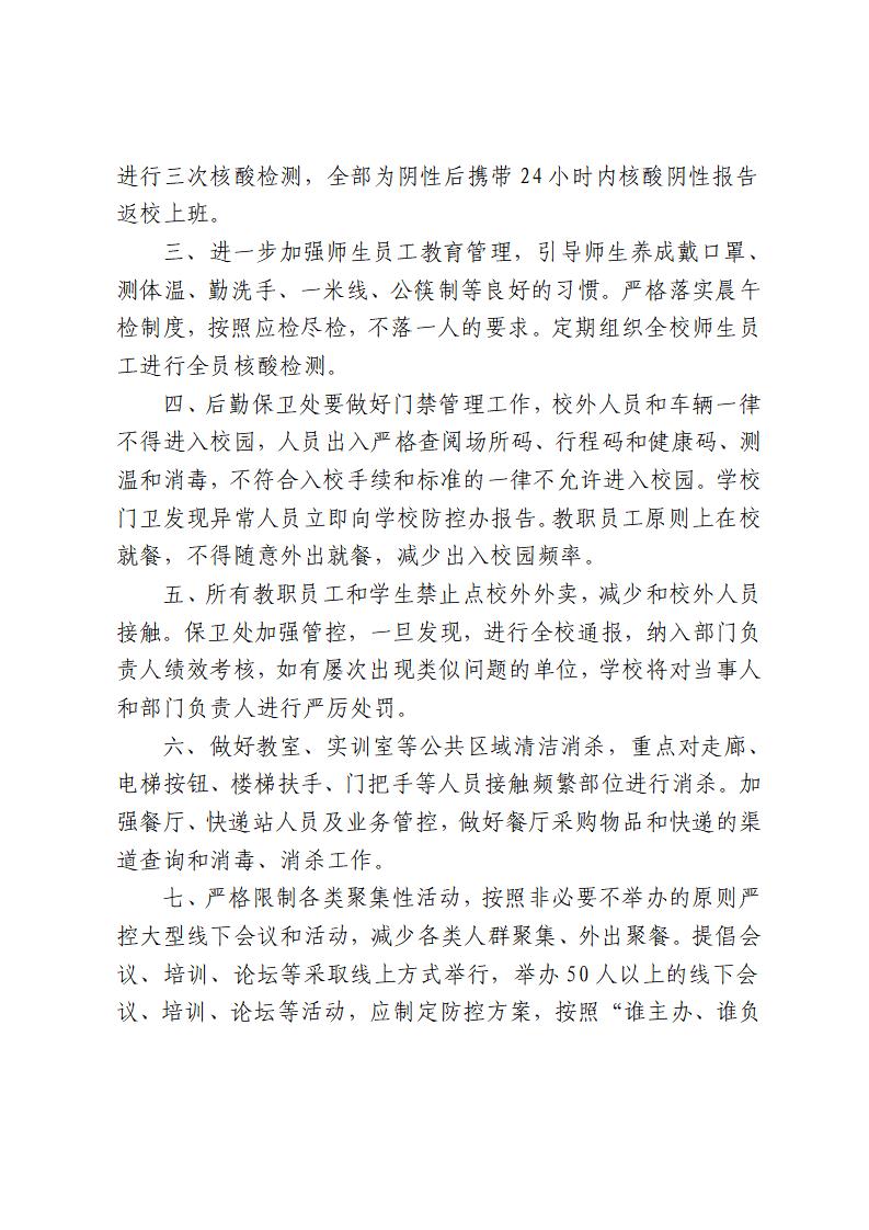 二、所有教职员工(含临时工和餐厅、快递站点工作人员)不得跨市域活动(招生人员除外),不得前往省内外中高风险区域,非必要不离许,若必须离许,务必向部门申请逐级报备批准后方可出行。返校前提前报备并自我居家隔离7天,第1/4/7天进行三次核酸检测,全部为阴性后携带24小时内核酸阴性报告返校上班。
