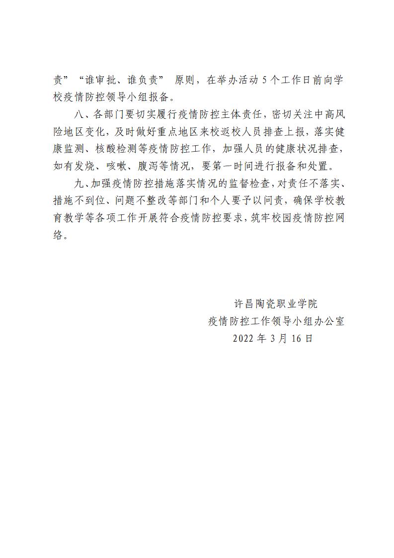 七、严格限制各类聚集性活动,按照非必要不举办的原则严控大型线下会议和活动,减少各类人群聚集、外出聚餐。提倡会议、培训、论坛等采取线上方式举行,举办50人以上的线下会议、培训、论坛等活动,应制定防控方案,按照“谁主办、谁负责”“谁审批、谁负责” 原则,在举办活动5个工作日前向学校疫情防控领导小组报备。