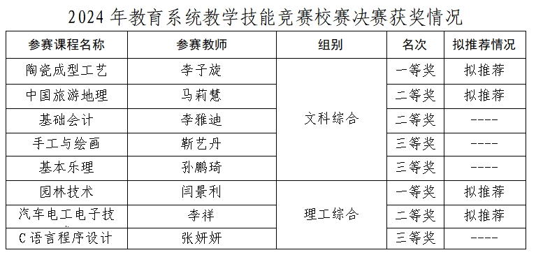 根据河南省总工会、河南省教育厅《关于在全省教育系统开展2024年度教学技能竞赛活动的通知》(豫工文〔2024〕52号)和许昌市总工会《关于举办2024年度许昌市教学技能竞赛(高职组)的通知》的文件精神,经各教学单位初赛、校级决赛专家评审等程序,文科综合与理工综合两个组别共确定一等奖2名、二等奖3名、三等奖3名,具体获奖情况及推荐情况见下表。