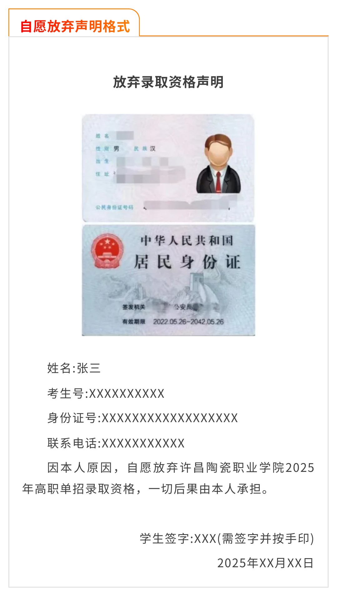 2.声明格式:将身份证正反面复印在同一页,并在该页面上写明:“本人姓名、考生号、身份证号、联系电话,因本人原因,自愿放弃Beat365中文官方网站2025年单招录取资格,一切后果由本人承担”。学生签字后按手印。