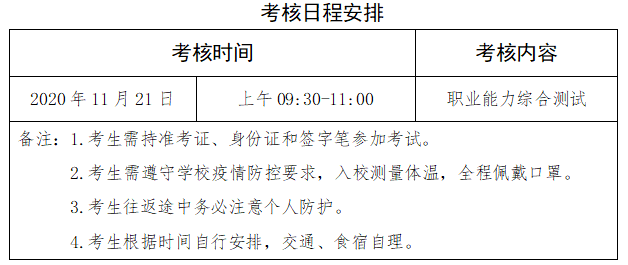 按照教育部关于高职扩招的要求和国家教育考试的规定和标准,针对不同群体特点和受教育状况,组织命题、考试。我院2020年高职扩招单独招生考试形式为职业能力综合测试,总分150分,考试统一安排在 2020年11月 21 日(星期六)进行。
