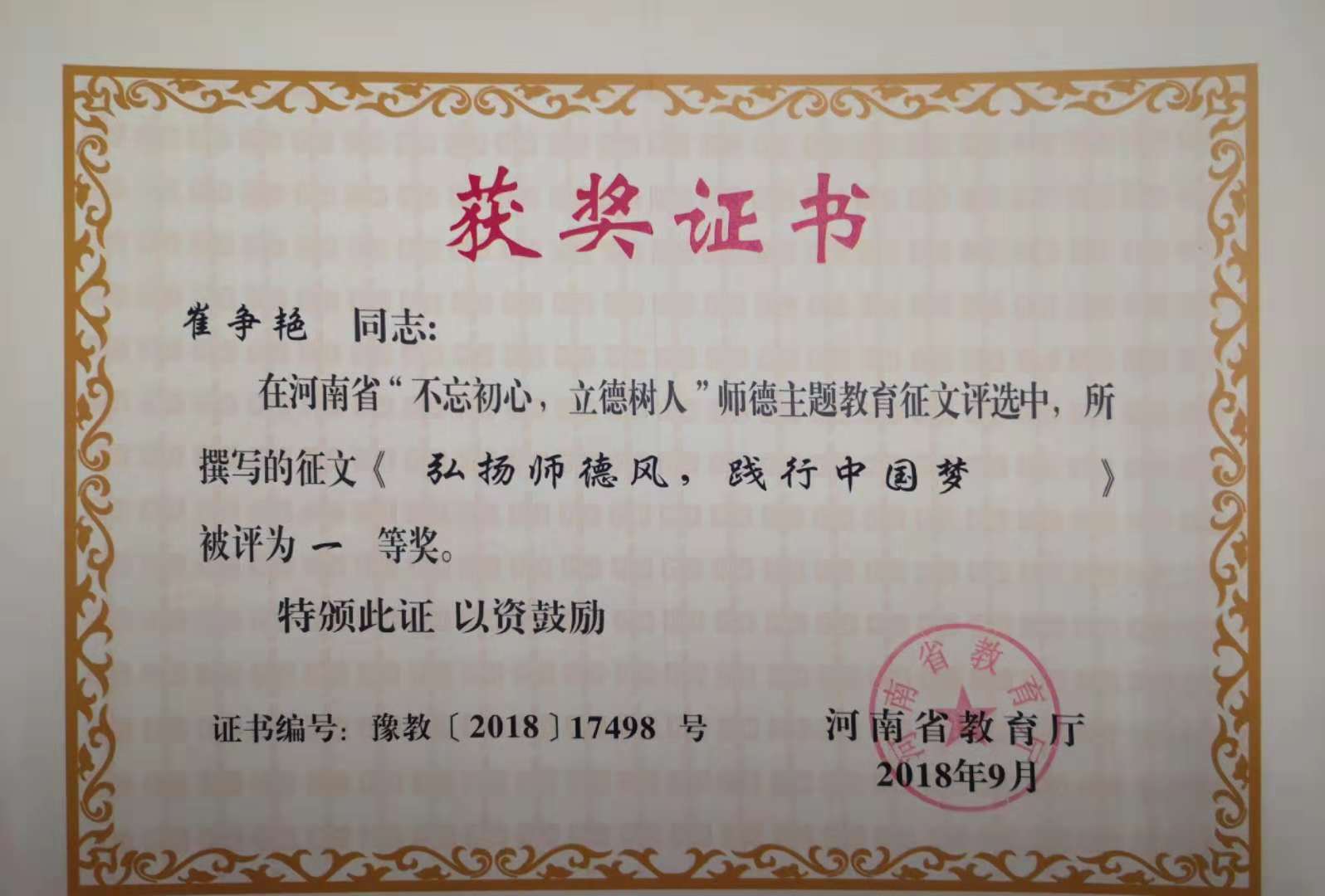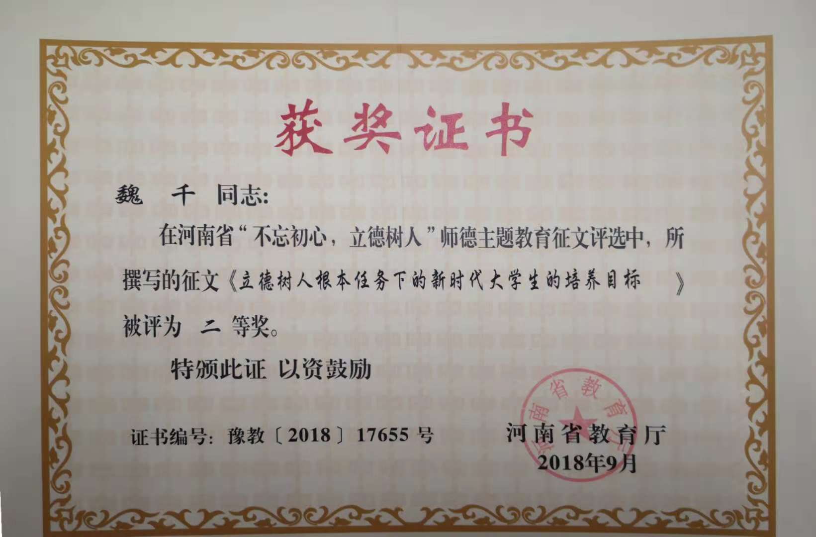 根据河南省教育厅教师【2018】793号文件通知,我院崔争艳、魏千两位老师在“不忘初心,立德树人”全省师德主题教育征文活动中分别荣获一等奖、二等奖。