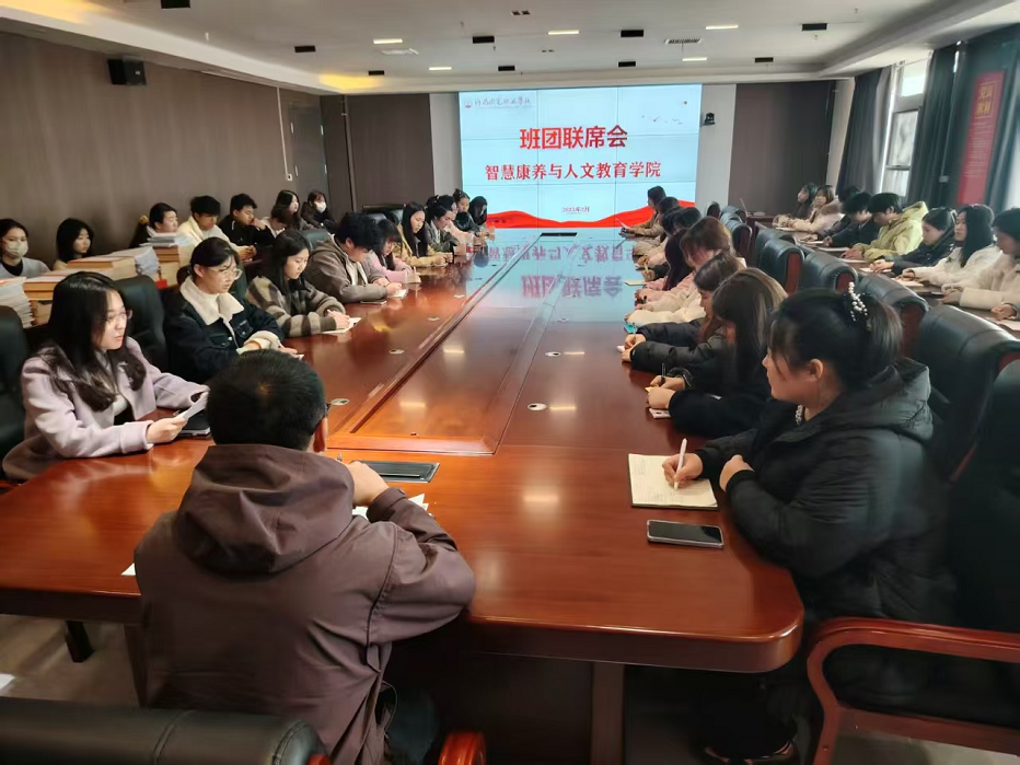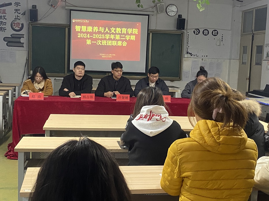 智慧康养与人文教育学院于2025年2月27日召开新学期首次班团联席会,班长、团支书及学生会成员共同参与。会议系统总结了上学期班级工作成效,重点分析文体活动开展、第二课堂组织中的经验与不足,并围绕新学期目标提出"加强学院文化建设、提升学业成绩"两大核心任务,强调以德智体美劳全面发展为导向。