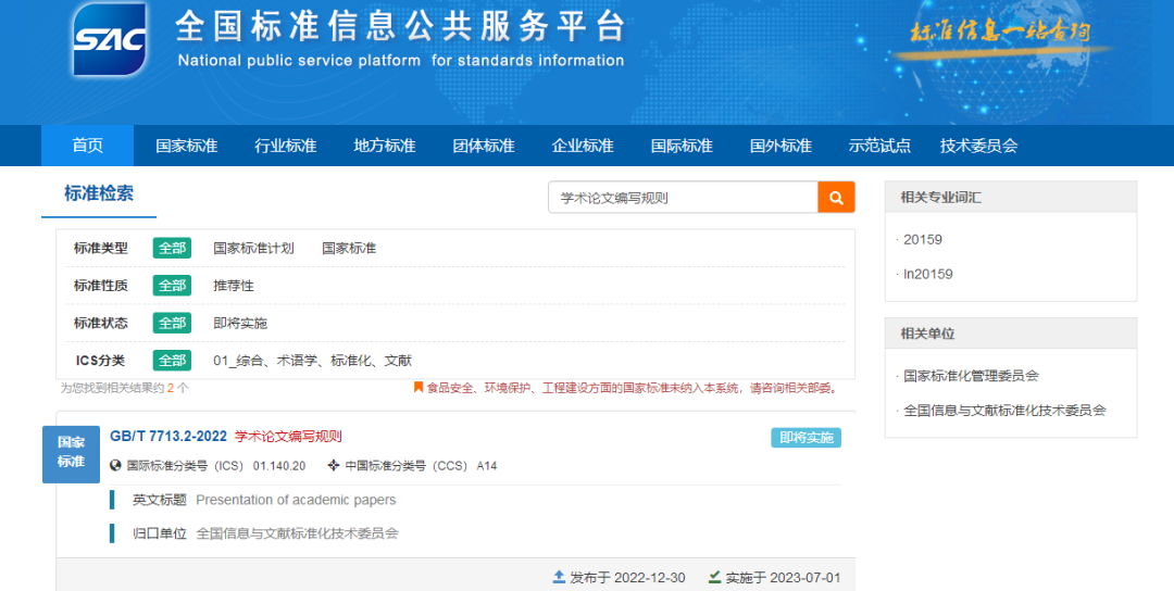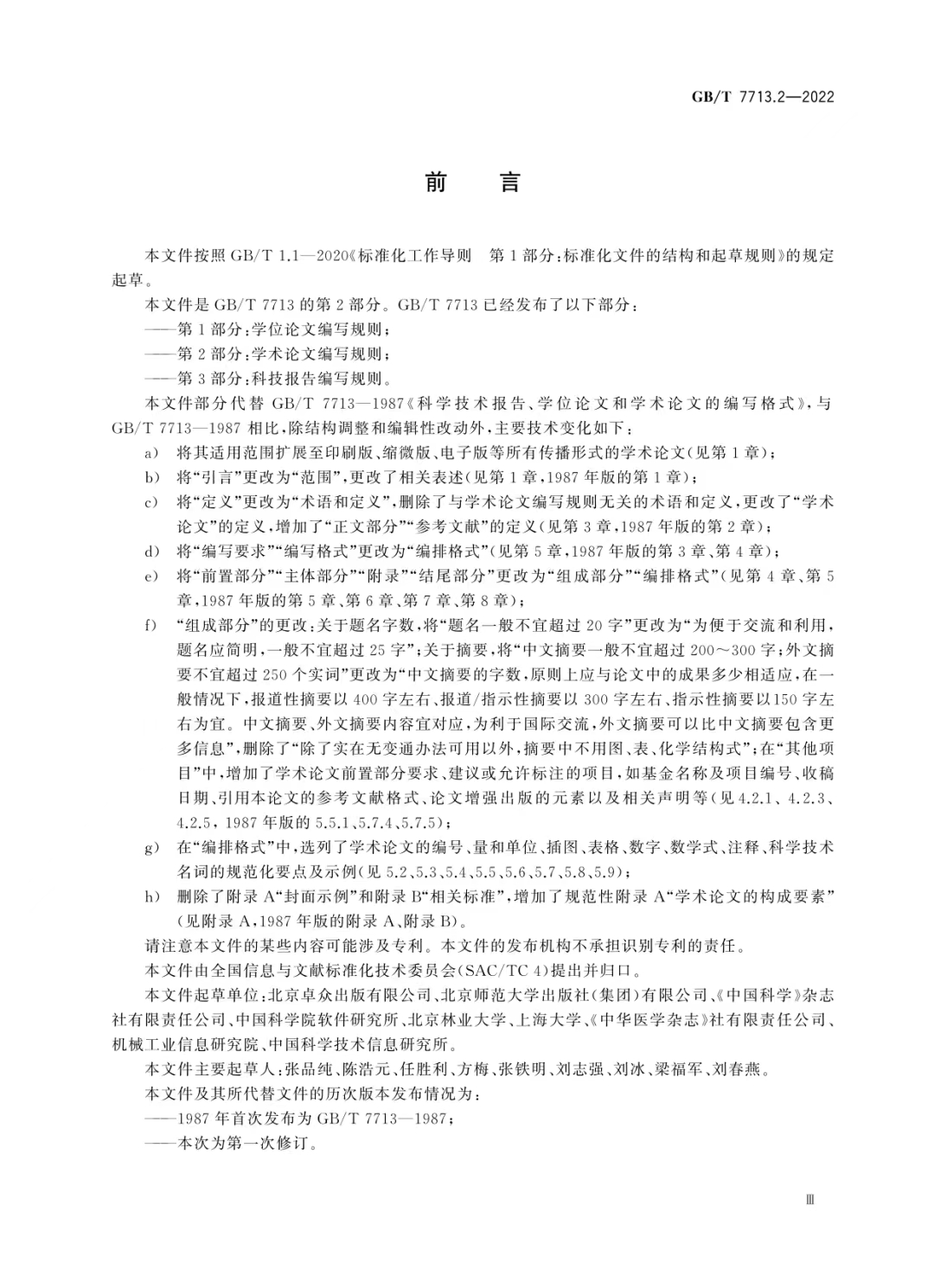 GB/T 7713.2-2022 学术论文编写规则》,该标准将于2023年7月1日起实施,部分替代GB/T 7713-1987。