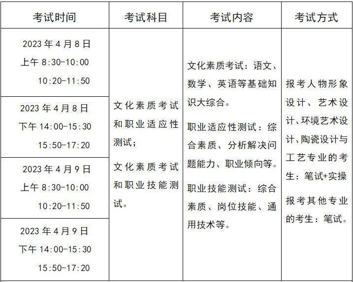 高中生和社会考生:考核项目为文化素质考试和职业适应性测试,总分600分,其中文化素质考试280分,职业适应性测试320分。