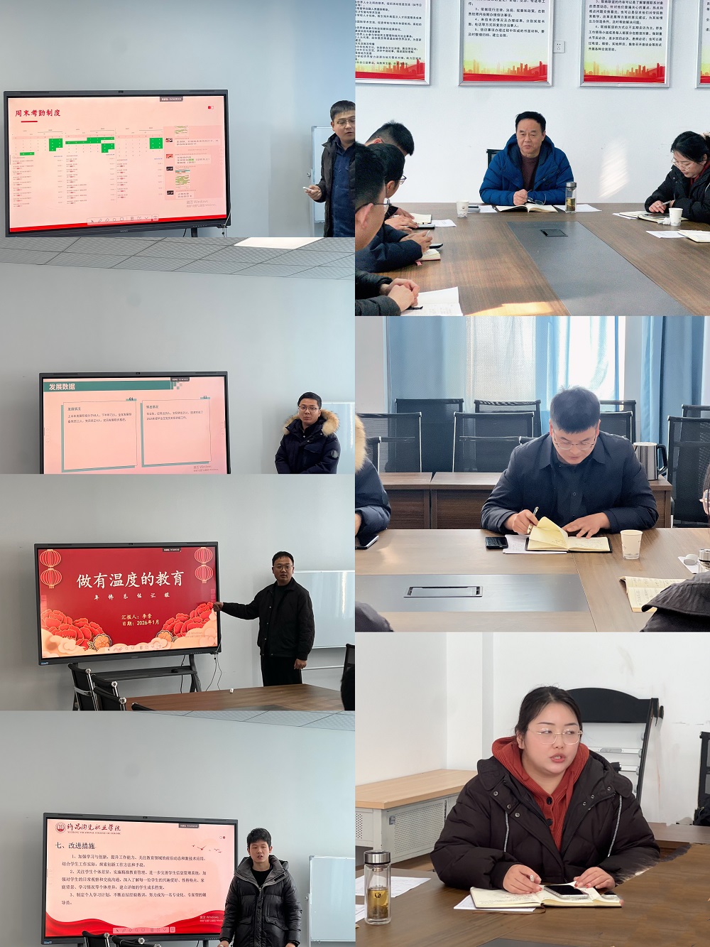 为全面总结2025年度学生工作成效,加强辅导员队伍建设,提升思想政治教育工作质量,陶瓷艺术与智能建造学院于2026年1月7日上午10时召开2025年度辅导员工作述职汇报会。学生处副处长王可喜、学院院长张永祥、学院学管秘书卢金刚和全体辅导员参加会议。