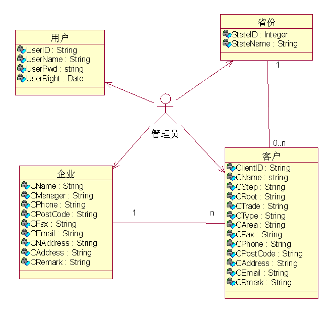根据系统需求功能,可以得到系统中使用的数据包括:用户、省份、企业和客户。下图为系统的类图描述: