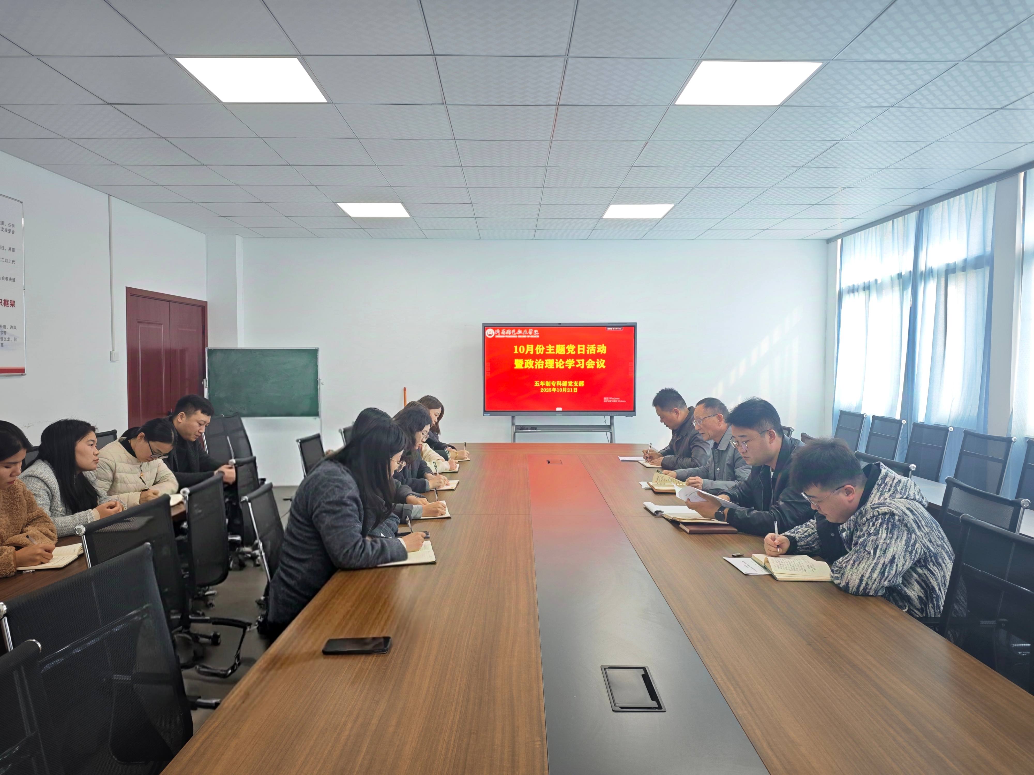 为进一步提升党员的政治理论素养,10月21日,五年制专科部党支部组织召开10月份主题党日活动暨政治理论学习会议。全体党员、入党积极分子参加了此次会议,会议由党支部书记宋群立主持。