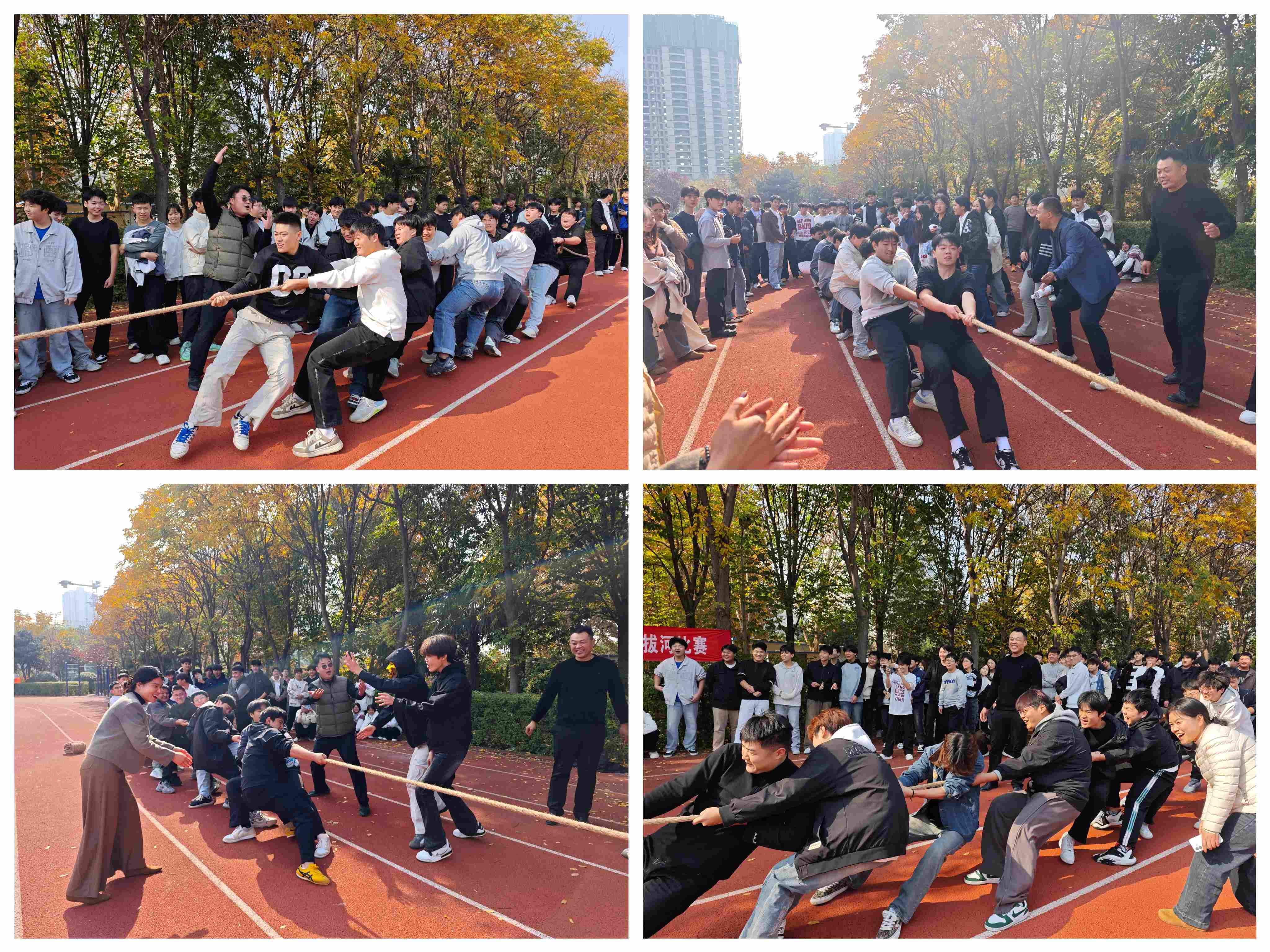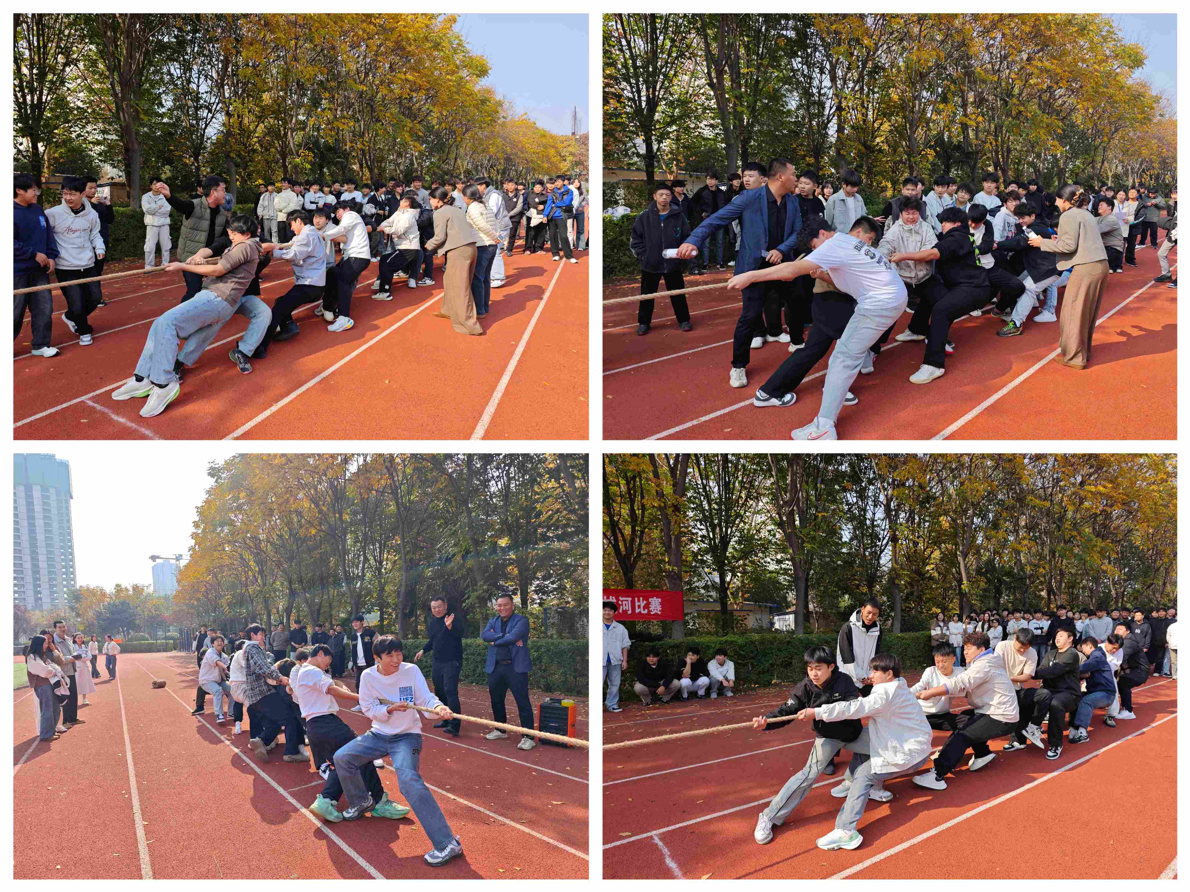 随着裁判员一声哨响,拔河比赛正式拉开帷幕。各参赛队伍精神抖擞、斗志昂扬,队员们紧握长绳、重心下沉,双脚稳稳扎根地面,伴随着整齐划一的口号,齐心协力向后发力。长绳中心的标记带在两队之间来回移动,胜负悬念扣人心弦。赛场边,师生们的加油声、呐喊声此起彼伏,气氛十分热烈。经过多轮激烈的角逐,最终决出一等奖1名,二等奖1名。