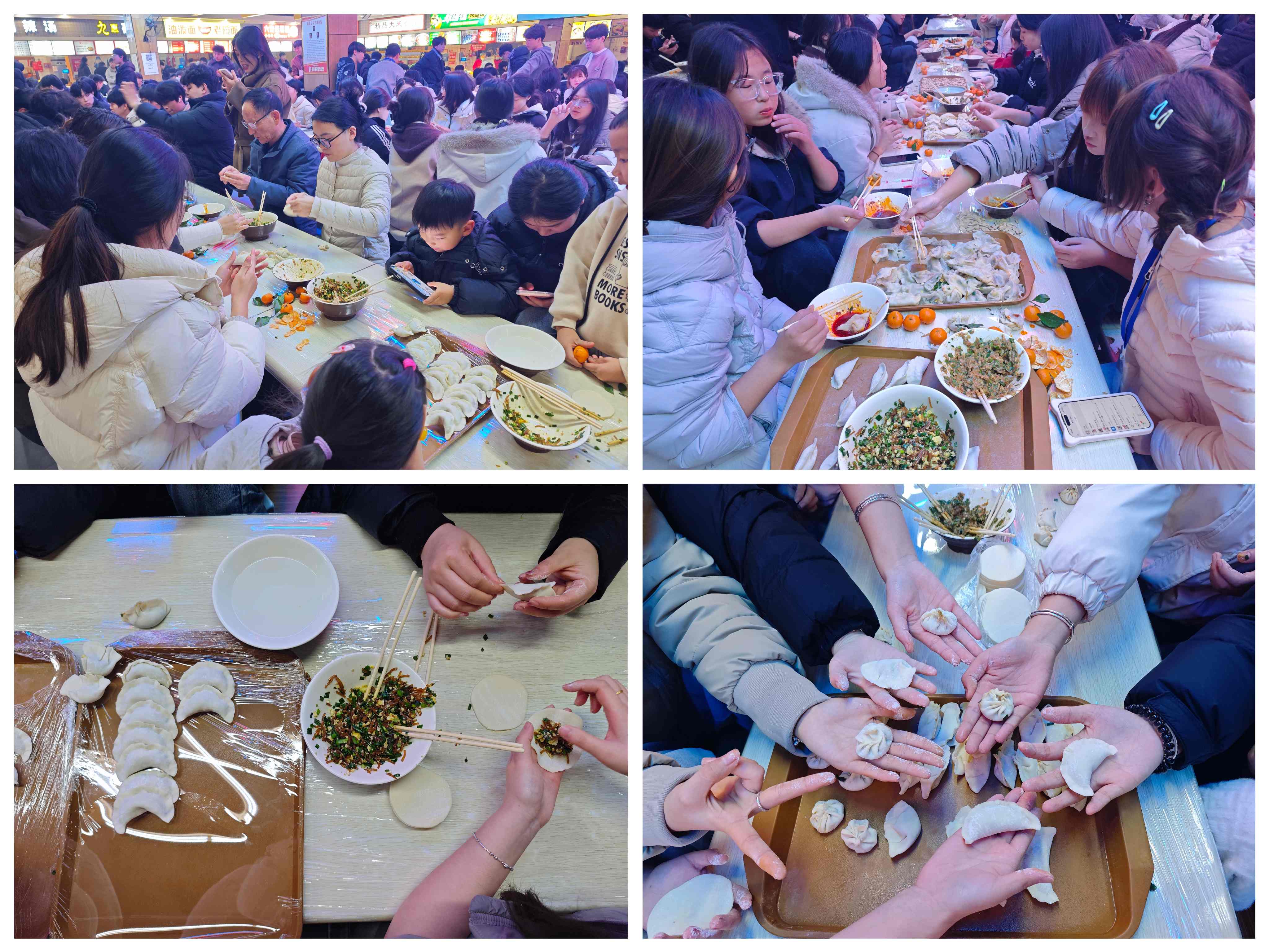 活动伊始,师生齐聚一堂,共同参与包饺子环节,大家围坐在一起,纷纷施展自己的包饺子技艺。老师们耐心地手把手教学生,如何将饺子皮摊平、放馅、捏褶,现场气氛其乐融融。同学们包出的饺子形态各异,有的小巧精致,宛如一个个弯弯的月牙;有的饱满厚实,饱含着对节日的美好期许。随着一锅锅热气腾腾的饺子出锅,师生们共同品尝着劳动的成果,感受着冬日的温馨与幸福。