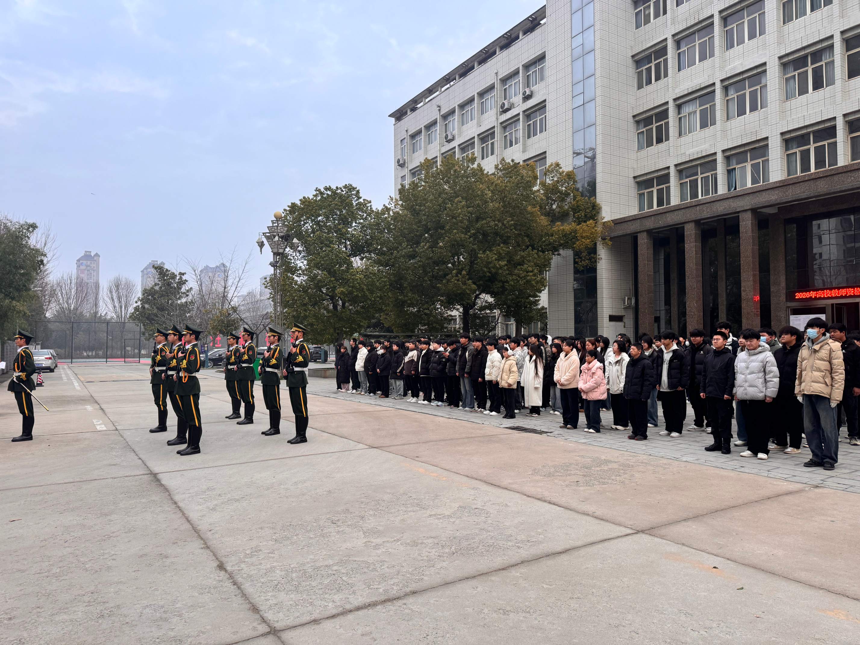 清晨七点整,升旗仪式正式开始。英姿飒爽的国旗护卫队迈着整齐有力的步伐,护送着鲜艳的五星红旗走向升旗台。在激昂雄壮的国歌声中,五星红旗迎着朝阳冉冉升起,全体学生面向国旗行注目礼,表达对祖国的无限热爱与崇高敬意。