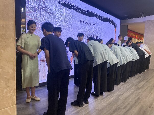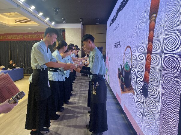 仪式现场氛围庄重而热烈,学生们满怀敬意,通过正衣冠、盥洗之礼、诵读拜师帖、敬奉拜师帖、奉茶等一系列传统而庄重的环节,正式拜企业资深从业者为师,尽显中华传统礼仪的厚重与学生们的求学热忱。