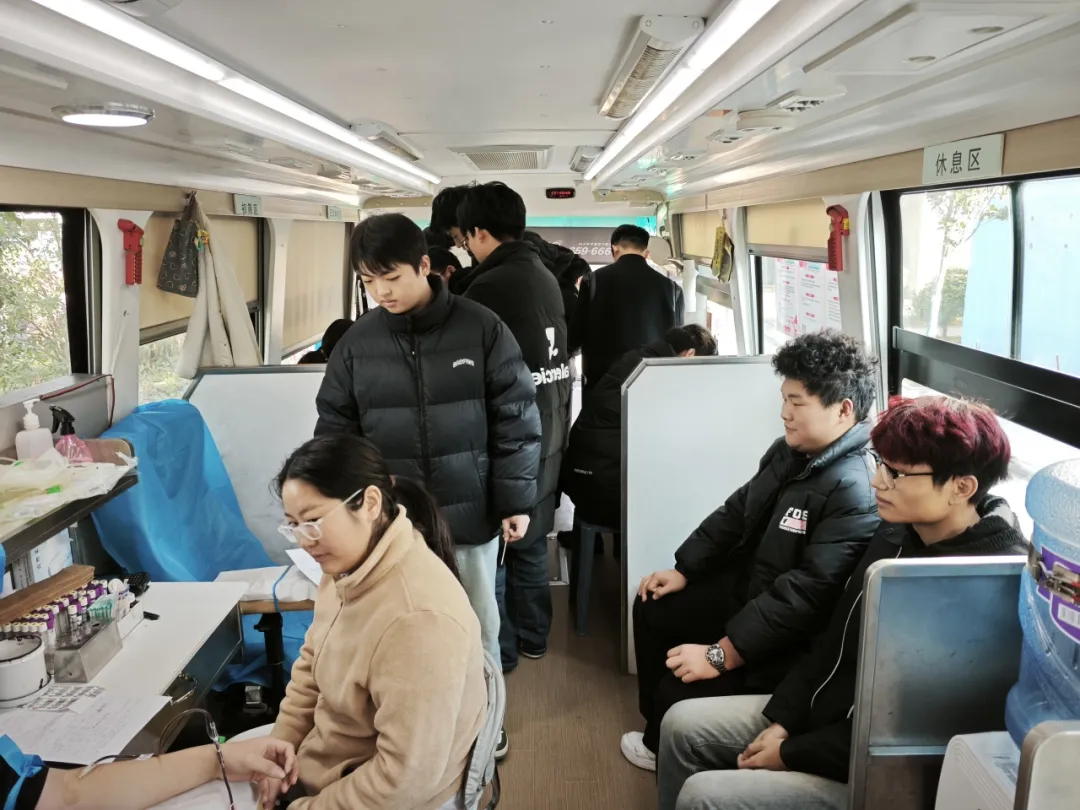 活动现场,献血车内秩序井然:师生们依次完成信息登记、健康征询、血液初筛等流程,采血区的医护人员规范操作,休息区的志愿者及时提供餐食与关怀。