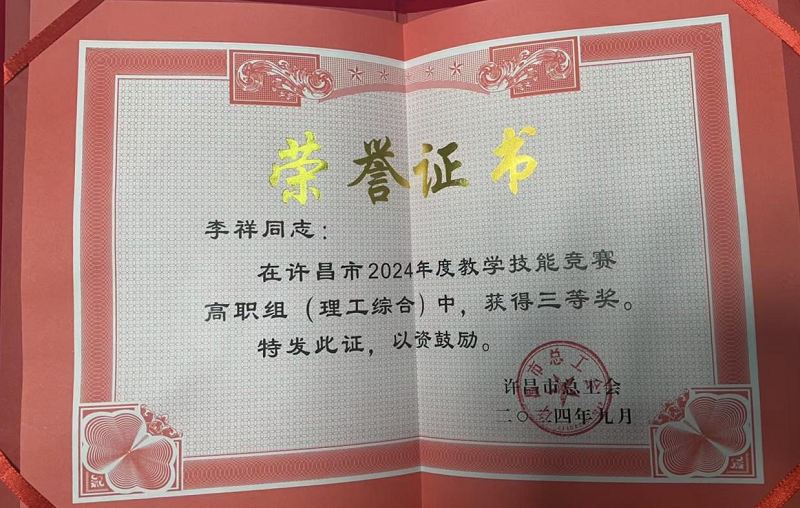 近日,在许昌市2024年度教学技能竞赛高职组(理工综合)中,我院李祥教师荣获三等奖。